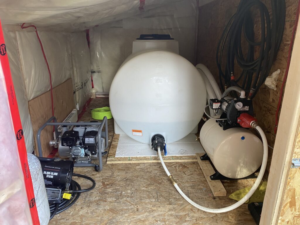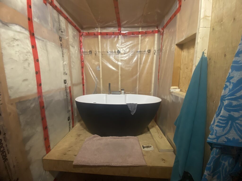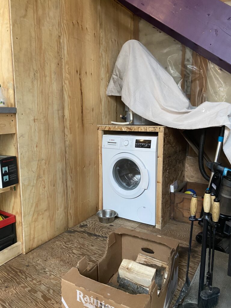 Then Seb built a small, insulated shed leaned to the cabin, in which we placed a big water tank, a jet pump and pressure tank, and a small board heater (because the shed should always stay above freezing point). Then he installed our bathtub, a sink, and our washing machine. While building the bathroom we added some bearing walls to support the joists of the second floor, which solved a pretty sketchy load distribution that we found around the stairs. Let’s say that we’re quite happy to plan a new house.