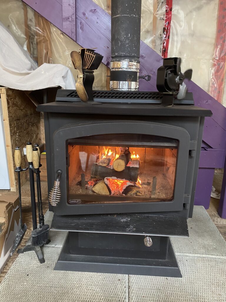 However, in the meantime, this cabin needs to be livable and safe. Winter being around the corner, and the most important thing was to get the cabin ready for the deep cold. The first thing we did was to buy a new wood stove. The one in the cabin was not airtight and thus smoking the whole building We went for a stove from Drolet. Their stoves are reliable and are highly efficient and people who bought them before us are very happy with their stoves. We did not need much more to be convinced so we went directly for their biggest model, which will be perfectly sized for our future home in such a cold climate. This was a very good decision. We did need half the winter to figure out how to work the stove properly because it is so over-dimensioned for this cabin. And you know how it is: you don’t want it to burn too hot, but also you can’t reduce the heat too much to avoid creosote building up too fast. So, we ended up getting some tropical temperatures in the cabin. After some weeks with outside temperatures reaching -35°C, we can confidently say that we’re delighted with this stove. It burns extremely efficiently. Some weeks, though the stove was on for 16-20 hours a day, we’ve only had to empty the ashes every 10 days.
