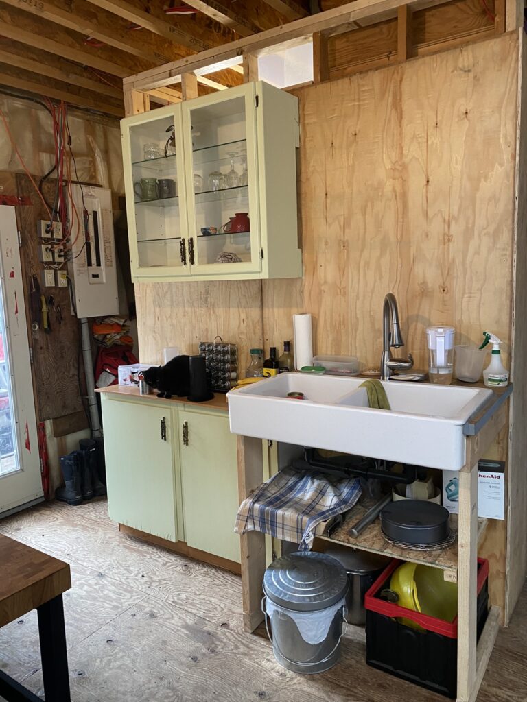 The last thing we did to bring some luxury to the cabin was to install some kitchen cupboards for extra storage for our food, cutlery, and glassware. I painted them to give a bit of color to the cabin since we decided to not finish the walls anymore.